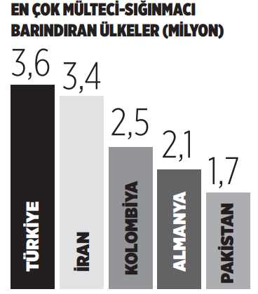 • 35,3 milyon yurtdışına kaçan, 62,5 milyonluk kişi ülke içinde yerlerinden edilenlerden oluşuyor.