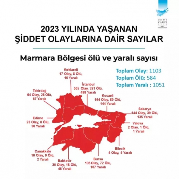 2023 yılında yaşanan silahlı şiddete bölgeler bazında bakıldığında; nüfus yoğunluğunun yaşandığı Marmara Bölgesi’ndeki 11 ilde yaşanan ve basına yansıyan toplam bin 103 olayda, 584 kişi öldürüldü, bin 51 kişi de yaralandı. Doğal olarak bir çok ülkenin nüfusundan kat kat fazla nüfusa sahip İstanbul 505 olayla en çok olayın yaşandığı kent. Basına yansıyan bu 505 şiddet olayında 321 kişi öldü, 498 kişi de yaralandı. İstanbul’u 80 kişinin öldüğü, 144 kişinin yaralandığı 164 olayla sanayi kenti Kocaeli, 144 olayla Sakarya, 135 olayla Bursa izliyor…