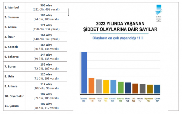 İller bazında bakıldığında ise 2023 yılında en çok şiddet olayının yaşandığı ilk 11 il şöyle: