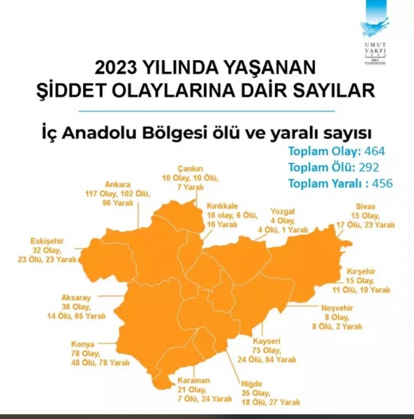 Aksaray’da 2023 yılında; 14 ölümlü, 65 yaralanmalı 38 silahlı şiddet olayı yaşanırken onu izleyen Niğde’de 18 ölümlü, 27 yaralanmalı 35 olay bulunuyor. Bölgedeki diğer illerde yaşanan şiddet olaylarının rakamları ise şöyle: