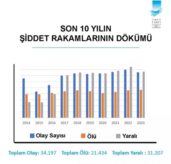 Umut Vakfı olarak; 2014 yılından bu yana medyaya yansıyan silahlı şiddet haberlerinin günü gününe çetelesini tutarak her yıl “Türkiye’nin silahlı şiddet haritası”nı raporlaştırıyoruz. Ki bu istatistiklere bakıldığında, 2014 yılından bugüne geçen 10 yılda; toplam 34 bin 197 silahlı şiddet olayı yaşandı, daha doğrusu medyaya yansıdı…