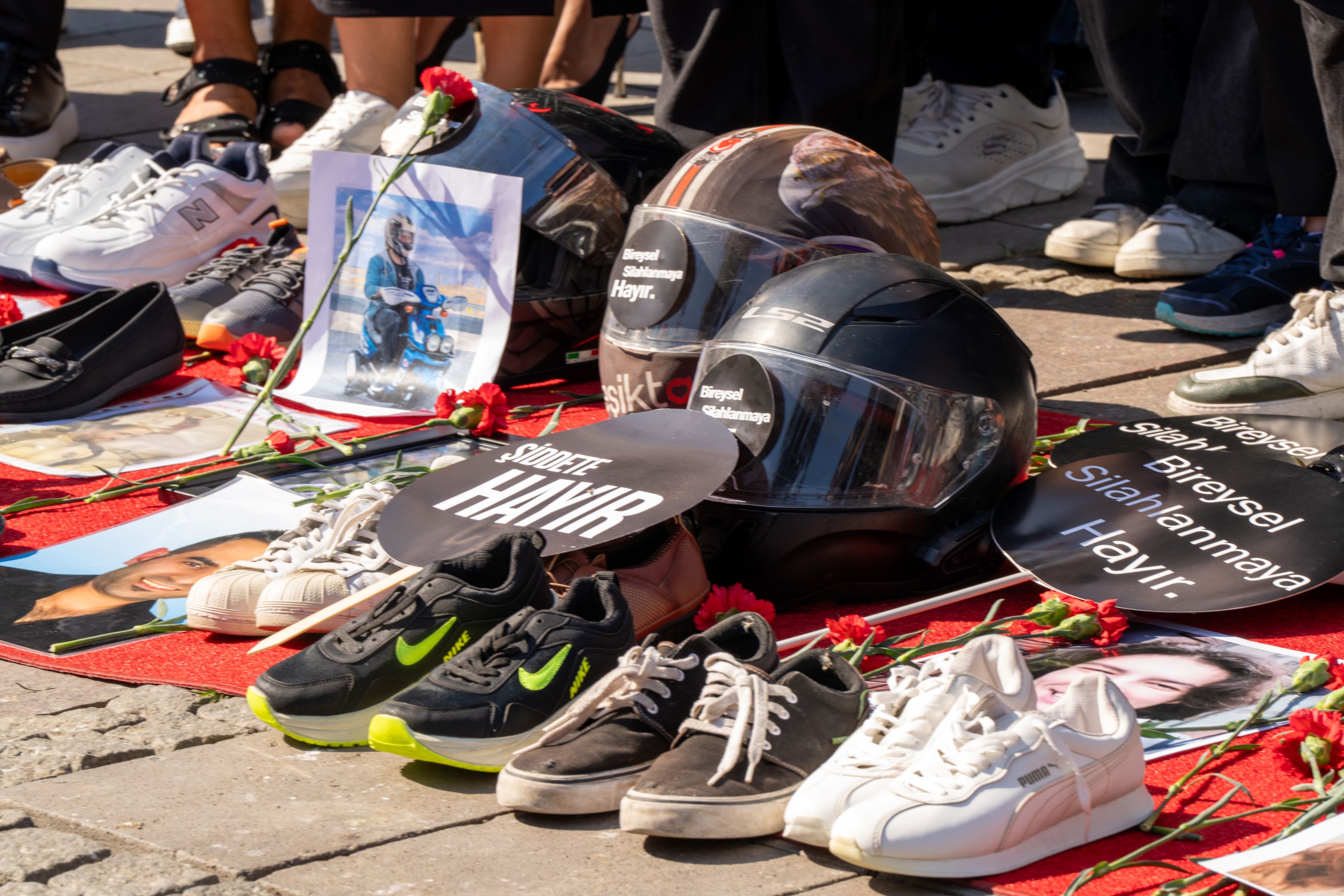 Konuşmaların sona ermesinden sonra tüm mağdurlar ve katılımcılar, kırmızı halının üzerine çocuklarının fotoğraflarını, ayakkabılar ve kırmızı karanfiller ile “Şiddeti hayır”, “Bireysel silahlanmaya hayır” dövizleri bıraktı. Sessizce şiddeti ve bireysel silahlanmayı protesto etti…