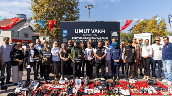 28 Eylül Bireysel Silahsızlanma Günü nedeniyle Umut Vakfı’nca düzenlenen “Sessiz Ayakkabılar Yürüyüşü” etkinliği bir türlü sonu getirilemeyen çeteleşmenin, sokak saldırılarının ve tüm Türkiye’yi yasa boğan gencecik bir polis memurunun bir suç makinesi tarafından öldürülmesinin gölgesinde Levent Çarşı Meydanı’nda mağdurların da katılımıyla yapıldı… Ülkede 15, 20, 30 hatta daha fazla suç kaydı bulunmasına karşın bu suçluların sokaklarda dolaştığına, çeteleşmenin arttığına, pervasızca sokaklarda çatıştıklarına dikkat çekilerek “artan şiddet ve bireysel silahlanma” konusunda ivedilikle önlem alınması istendi…
