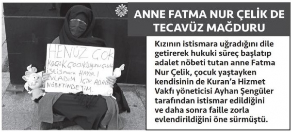 TECAVÜZE uğradıktan sonra evlendirildiği Kuran’a Hizmet Vakfı yöneticisinin, kızına da cinsel istismarda bulunduğunu iddia ederek dava açan Fatma Nur Çelik ve kızı ölü bulundu. Tehditler aldığını belirten Çelik, “Eğer ölürsem bu intihar değildir” demişti. Türkiye, Kuran’a Hizmet Vakfı yöneticisi A. Ş. tarafından istismar edilen anne Fatma Nur Çelik ile 8 yaşındaki kızının şüpheli ölümünü konuşuyor.