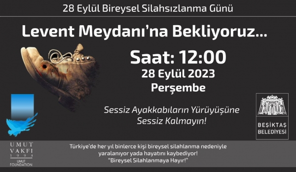 Gelin, 28 Eylül Bireysel Silahsızlanma Günü’nde Levent Meydanı’nda Beşiktaş Belediyesi’nin katkılarıyla düzenlediğimiz “Sessiz Ayakkabılar Yürüyüşü” etkinliğimizde buluşalım. Silahlı şiddet, maganda cinayetleri sonucu hayatını kaybetmiş olanların sessiz çığlığı olarak haykıralım, geleceğe yönelik umutlarımızı artıralım…