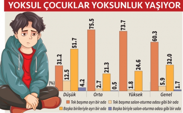 -Çocukların yüzde 60’ının kendisine ait ayrı bir odası varken yüzde 32’i odasını başka biriyle paylaşıyor.