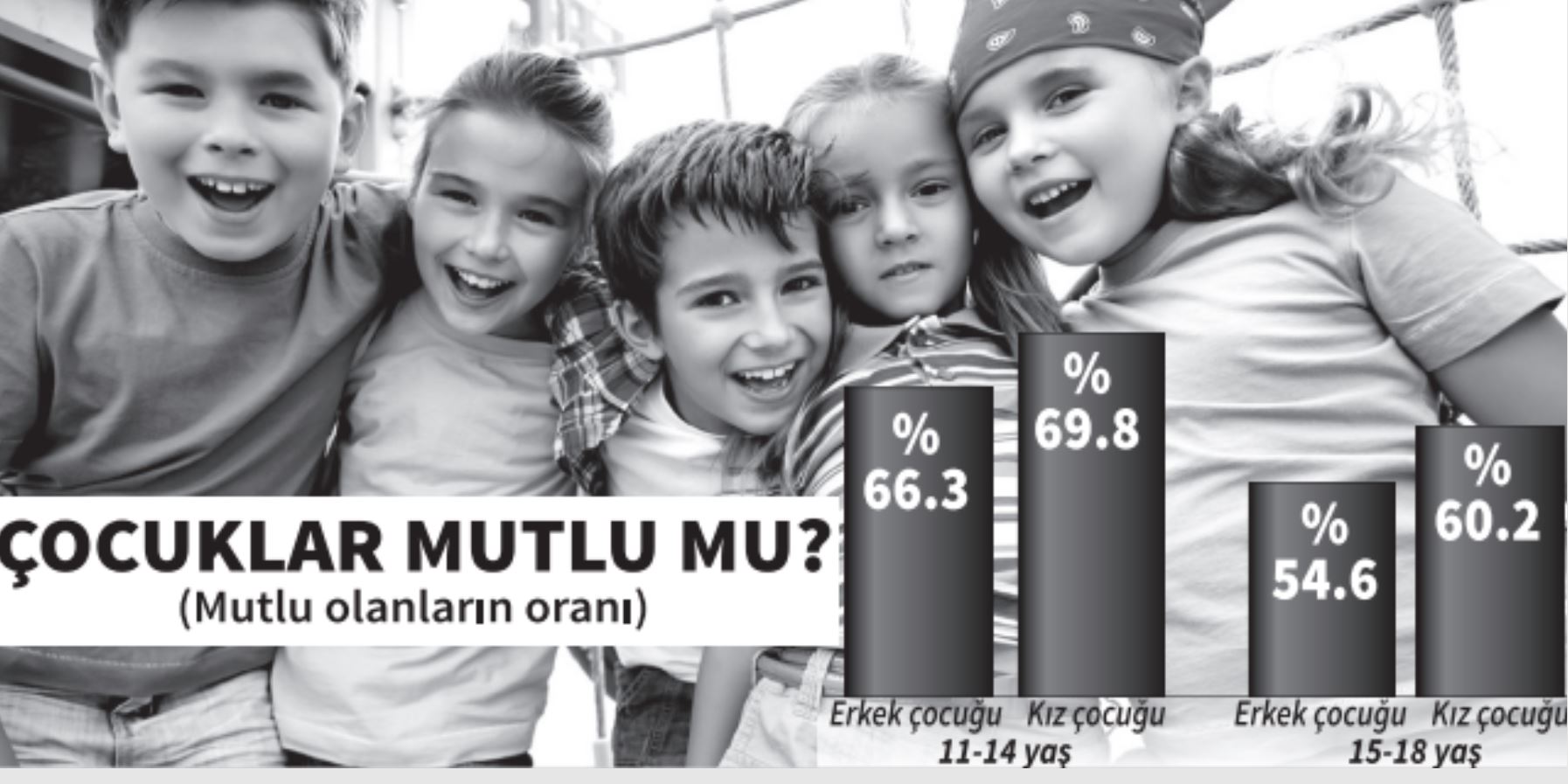 -Araştırmaya göre çocukların yaşamından memnuniyeti 11-14 yaş arasında erkeklerde yüzde 66.3, kızlarda ise yüzde 69.8. Bu oran çocukların yaşların ilerledikçe daha da düşüyor. 15-18 yaş arası erkek çocukların yüzde 54.6’sı, kız çocuklarınında yüzde 60.2’si yaşamlarından memnun değil.