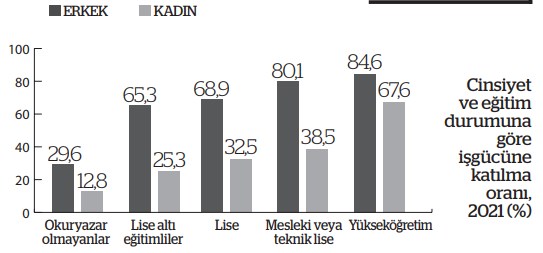 Verilere göre, 2021 yılında 15 ve daha yukarı yaştaki istihdam edilenlerin oranının yüzde 45,2 olduğu görüldü. Bu oran kadınlarda yüzde 28,0, erkeklerde ise yüzde 62,8 oldu.