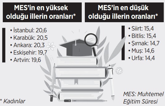 TÜİK verilerine göre, il düzeyinde en yüksek muhtemel eğitim süresi, 20,3 yıl ile İstanbul’da gerçekleşti. Bunu Karabük, Ankara, Bayburt ve Rize izledi. Muhtemel eğitim süresi en düşük olan iller, 15,2 yıl ile Urfa ve Muş olurken bu illeri Şırnak, Ağrı ve Mardin takip etti. Muhtemel eğitim süresi, 2022 yılında kadınlar için 18,3 yıl, erkekler için 18,1 yıl oldu. Her iki cinsiyette de en yüksek muhtemel eğitim süresi değeri İstanbul’da gerçekleşti. Muhtemel eğitim süresinin erkeklerde en düşük olduğu il Ağrı olurken kadınlarda da Urfa ilk sırada yer aldı.