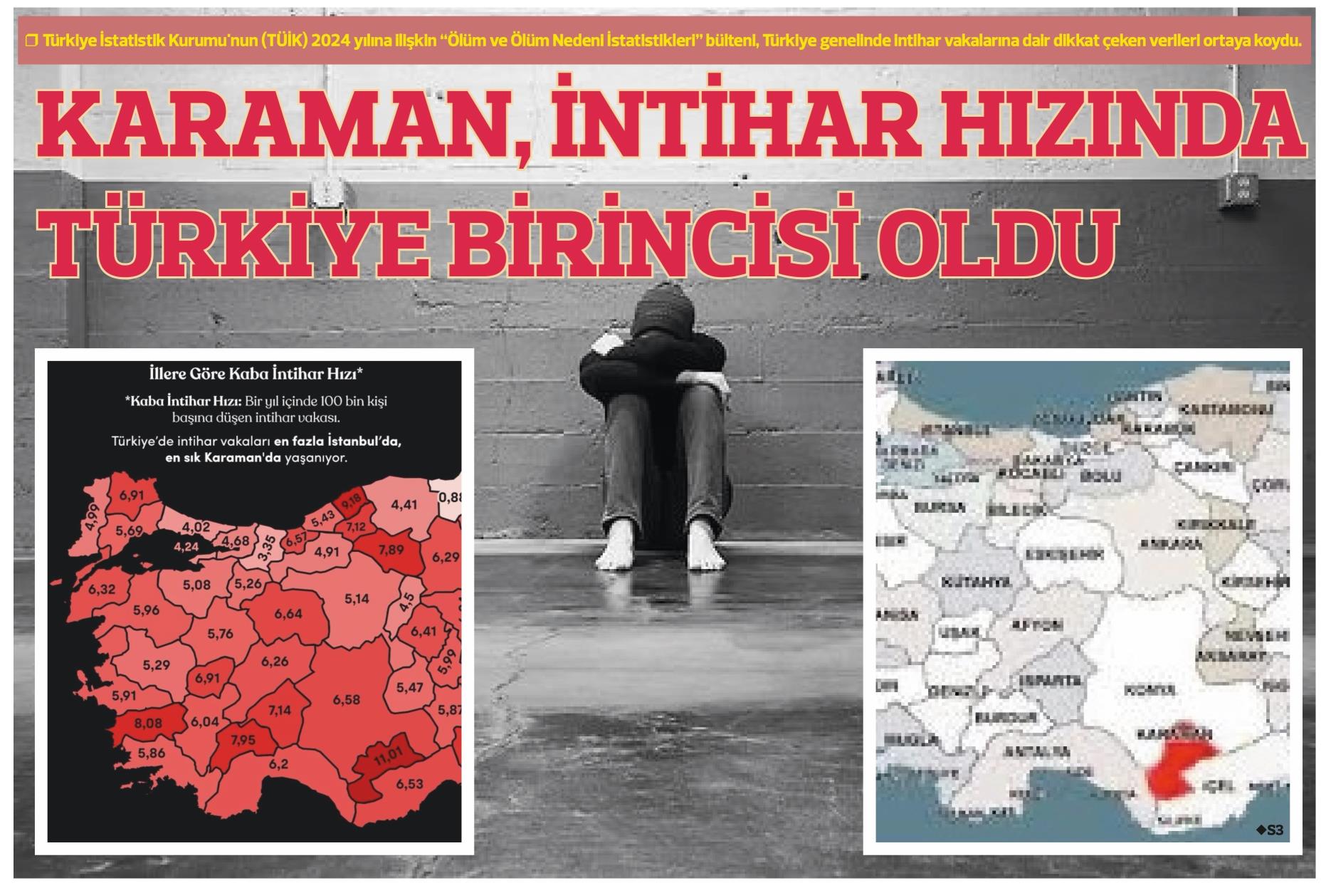 Türkiye İstatistik Kurumu’nun (TÜİK) 2024 yılına ilişkin “Ölüm ve Ölüm Nedeni İstatistikleri” bülteni, Türkiye genelinde intihar vakalarına dair dikkat çeken verileri ortaya koydu. Açıklanan verilere göre, Karaman ili, kaba intihar hızında (her 100 bin kişide görülen intihar sayısı) Türkiye genelinde ilk sırada yer aldı.