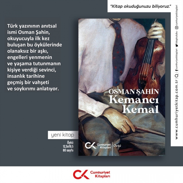 Usta öykücü Osman Şahin, Cumhuriyet Kitapları tarafından yayımlanan Kemancı Kemal kitabıyla okuyucuya yeniden “Merhaba” diyor. Şahin ‘in kitabında, Srebrenitsa Soykırımını konu edindiği “Srebrenitsa 1915”, Sarey ile kocası Porik ve Yusufi arasında geçen bir aşk hikâyesi olan “Sarey” ve duyarlı bir sanatçı olan engelli Kemal’in ağzından engelli bireylerin karşılaştıkları zorlukları anlattığı “Kemancı Kemal” öyküleri yer alıyor.