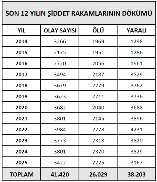 Bu raporlara bakıldığında o yıldan bugüne silahlı şiddet dalgalı bir trend izliyor… Ve 2014 yılından 2026 yılına kadar son 12 yılda toplam 41 bin 420 silahlı şiddet olayı basına yansımış bulunuyor. Bu 41 bin 420 silahlı şiddet olayında 12 yılda 26 bin 29 kişi öldü, bir kısmı ağır 38 bin 203 kişi de yaralandı… Not düşmeliyiz ki; Yaralılardan ne kadarı daha sonra hayata tutundu, ne kadarı yaşama veda etti bilgi sahibi değiliz…