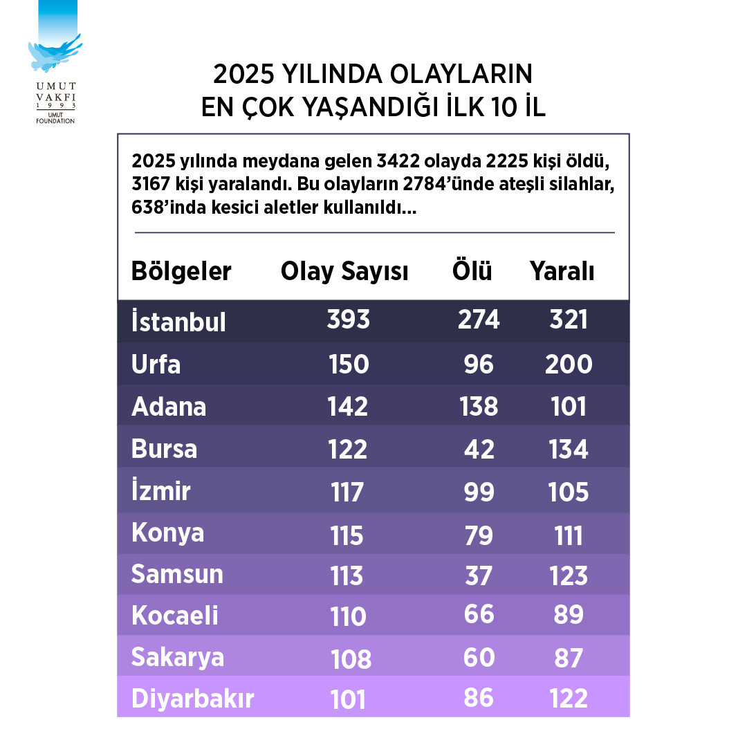 Umut Vakfı olarak 2014 yılından bu yana basında çıkan silahlı şiddet haberlerini günü gününe izleyerek, derleyerek yılın basında yer alan “Silahlı Şiddet” olaylarının raporunu hazırlıyoruz…