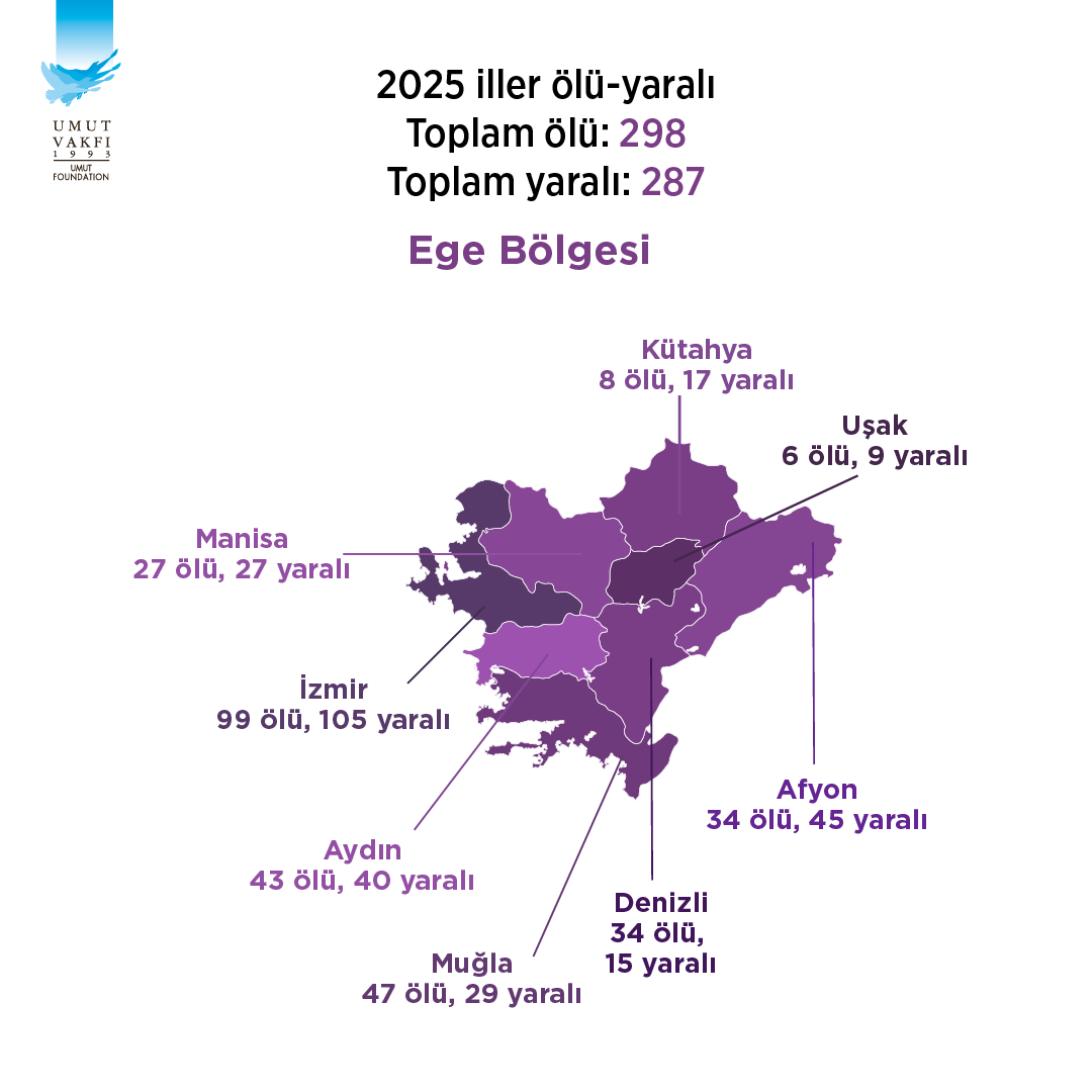 Ege Bölgesi’nden de 2025 yılında toplam 393 silahlı şiddet olayı medyaya yansıdı. İzmir’de 99 ölümlü, 105 yaralamalı 117 silahlı şiddet olayı yaşanırken Aydın’da 43 ölümlü, 40 yaralamalı 72 olay, Muğla’da 47 ölümlü, 29 yaralamalı 63 olay yaşandı.