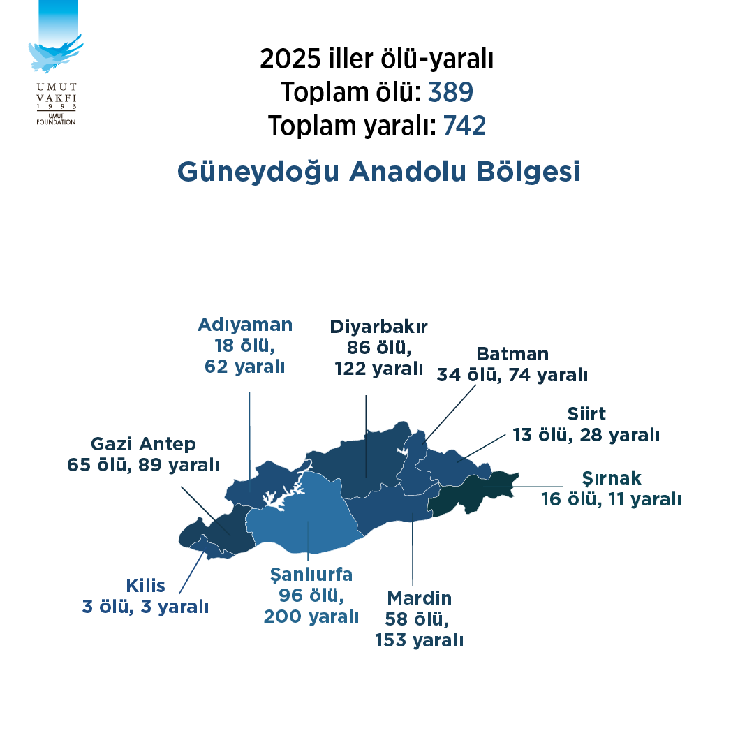 Güneydoğu Anadolu bölgesi 2025 yılında da en çok silahlı şiddetin yaşandığı ikinci bölge… Dokuz ili kapsayan Güneydoğu Anadolu Bölgesi’nde 2025 yılında 389 ölümlü, 742 yaralanmalı toplam 582 silahlı şiddet yaşandı… Bölgede en çok Urfa’dan silahlı şiddet olayı basına yansıdı ki; 150 olayda 96 kişi öldü, 200 kişi yaralandı…