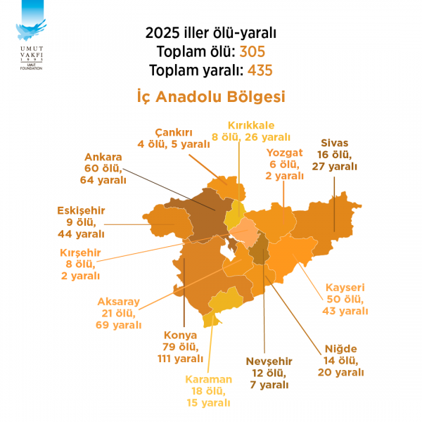 “Eskişehir: 39 olay (9 ölü, 44 yaralı), Karaman: 27 olay (18 ölü, 15 yaralı), Niğde: 27 olay (14 ölü, 20 yaralı), Kırıkkale: 19 olay (8 ölü, 26 yaralı), Sivas: 17 olay (16 ölü, 27 yaralı), Nevşehir: 16 olay (12 ölü, 7 yaralı), Kırşehir: 6 olay (8 ölü, 2 yaralı), Çankırı: 6 olay (4 ölü, 5 yaralı), Yozgat: 5 olay (6 ölü, 2 yaralı).”