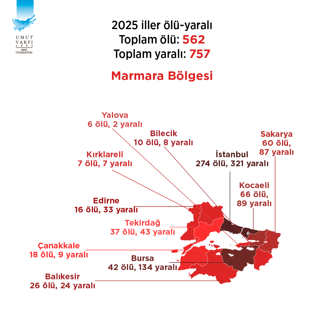 Marmara Bölgesi’nde 2025 yılında İstanbul’da 274 ölümlü, 321 yaralanmalı 393 olay basına yansıdı. Bölgedeki diğer illerden ise; Bursa’da 42 ölümlü, 134 yaralanmalı 122 olay, Kocaeli’nde 66 ölümlü, 89 yaralanmalı 110 olay, Sakarya’da 60 ölümlü, 87 yaralanmalı 108 olay, Tekirdağ’da 37 ölümlü, 43 yaralanmalı 63 olay, Edirne’de 16 ölümlü, 33 yaralanmalı 39 olay, Balıkesir’de 26 ölümlü, 24 yaralanmalı 31 olay, Çanakkale’de 18 ölümlü, dokuz yaralanmalı 21 olay, Bilecik’te 10 ölümlü, sekiz yaralanmalı 13 olay, Kırklareli’nde yedi ölüm ve yedi yaralanmalı dokuz olay, Yalova’da altı ölüm, iki yaralanmalı yedi olay basında yer aldı…