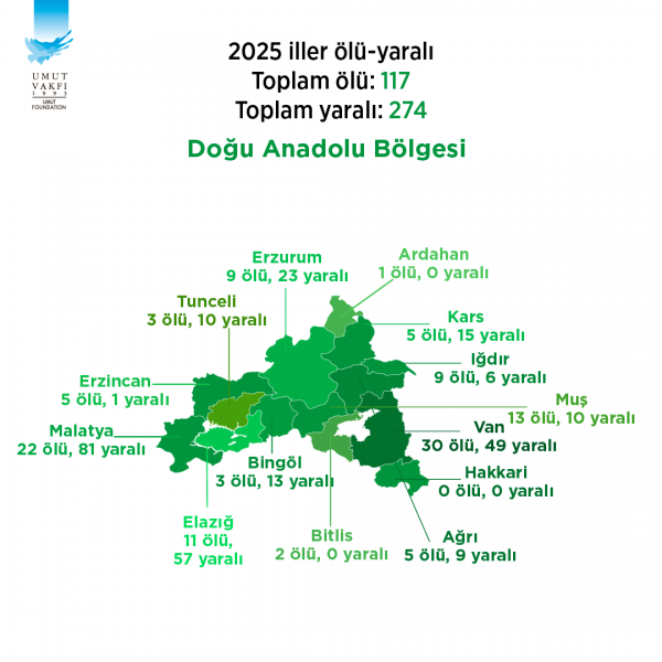Bölgede; Erzurum’da 17 (9 ölü, 23 yaralı), Muş’ta 11 (13 ölü,10 yaralı), Kars’ta 11 (beş ölü, 15 yaralı), Iğdır’da 7 (Dokuz ölü, altı yaralı), Ağrı’da 7 (beş ölü, dokuz yaralı), Tunceli’de 5 (üç ölü, 10 yaralı), Bingöl’de 5 (iki ölü, 13 yaralı), Erzincan’da 4 ( beş ölü, bir yaralı), Bitlis’te 2 (iki ölü), Ardahan’da 1 (bir ölü) olay yaşandı.