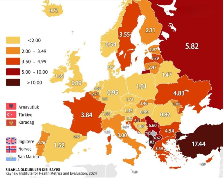 Avrupa’da silahla ölüm oranın en düşük olduğu ülkeler ise İngiltere, Norveç ve San Marino oldu.