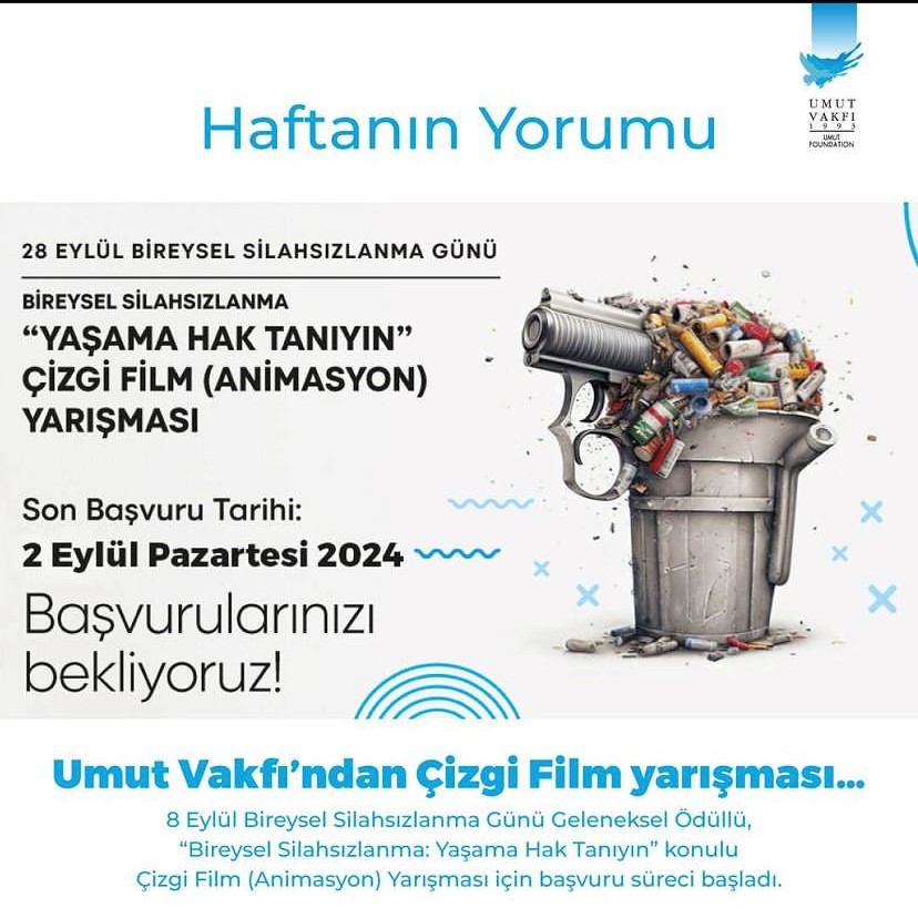 Umut Vakfı’nın geçen yıl düzenlediği ve yeterli katılım olmadığı için 2024 yılına ertelediği 28 Eylül Bireysel Silahsızlanma Günü Geleneksel Ödüllü, “Bireysel Silahsızlanma: Yaşama Hak Tanıyın” konulu Çizgi Film (Animasyon) Yarışması için başvuru süreci başladı.